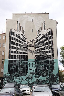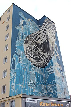 Przy ulicy Starowiejskiej 38 znajduje się mural autorstwa Jana Bajtlika (widoczny również od ulicy 3 Maja). To realizacja, która operuje przede wszystkim literą i rytmem kompozycji. Nie opowiada konkretnej historii, ale prowokuje do czytania miasta jak tekstu — z przerwami, akcentami i pauzami.