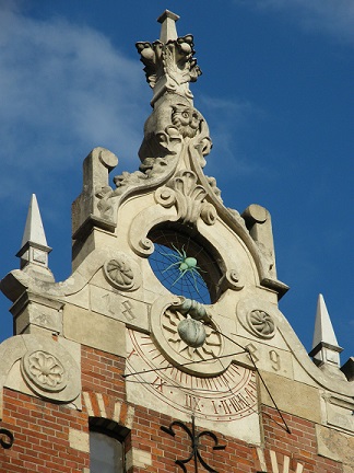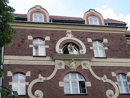 Najpierw staje przed Tobą kamienica „Pod Osłem”. Talowski — nazywany „polskim Gaudím” — zaprojektował ją dla siebie i widać to już na pierwszy rzut oka. Pociemniała cegła, delikatna asymetria, uskoki, detale z kamienia i słynna głowa osła patrząca z góry na przechodniów. Całość wieńczy łacińska sentencja: Faber est suae quisque fortunae — „każdy jest kowalem własnego losu”.